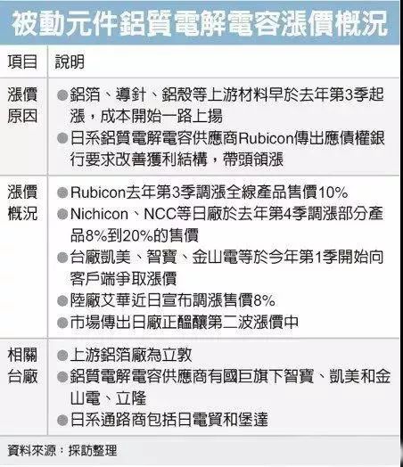 厂艾华近日宣布调涨售价8%,台厂国巨集团旗下的智宝和凯美、金山电、立隆,以及日系通路商日电贸等有望跟进,这是继积层陶瓷电容(市场分析,因铝质电解电容广泛使用在桌上型电脑、电源供应器、网通等各式终端产品,系统厂今年成本压力仍高。去年起,MLCC、铝质电解电容、固态电容、钽质电容等多项次产品即开始缺货,进而狂吹涨风。从涨势来看,去年涨幅最凌厉的次产品首推MLCC,铝质电解电容、固态电容只有日厂微幅调涨3%-5%不等,不若MLCC凶猛。不过,今年初以来,不但供应紧张的晶片电阻跟上涨势,铝质电解电容也因为去年起上游材料铝箔连番涨价,成本累计已大涨逾三成,供应商成本警报大响,开始跟涨。根据陆媒报导,当地最大铝质电解电容厂艾华已经宣布,因去年原材料大幅度涨价,且供应更加紧缺,主要原材料涨幅超过12%,因此向客户提出涨价8%。这一波铝质电解电容涨价潮,起因于日厂Rubicon最早应债权银行要求改善获利结构,去年第3季起退出不赚钱的领域,并向客户端全线调涨产品售价一成,佳美工(Nippom Chemi-Con)、尼吉康(Nichicon)于第4季跟涨。台厂虽在今年第1季喊涨,但因对手陆厂当时并未跟进,大多只能针对严重负毛利的品项或新客户调整售价,涨幅有限。